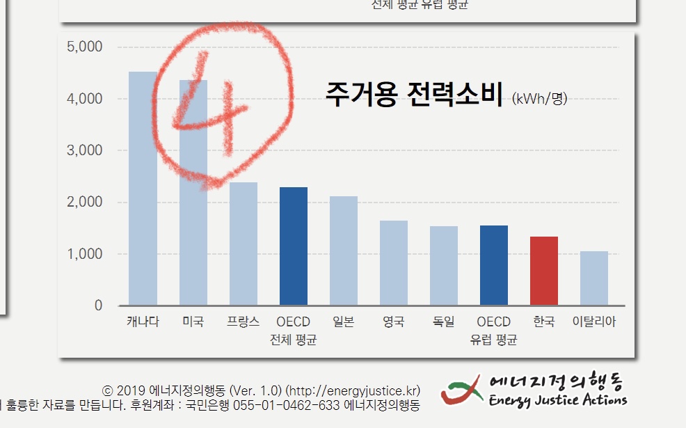 첫째, 한국인들의 현재 가정용 전기, 가스, 물 소비량은 결코 낭비적 수준이 아니다. (첨부사진4. 이헌석씨가 오랫동안 활동하신 에너지정의행동 자료인 건 아이러니.)