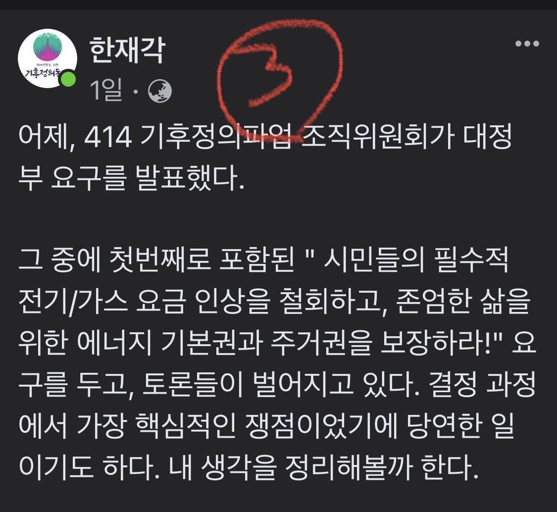 그런 점에서 414기후정의파업 측이 "가정용 요금인상 철회"에서 "필수적 요금 인상 철회"로 용어를 바꾼 것은 우려스럽다. 가정용이라는 비교적 경계가 분명한 기준에서 혹시 후퇴하는 것일까 싶기 때문이다. 한재각 씨의 해설을 읽고 나서는 더욱 그렇다.