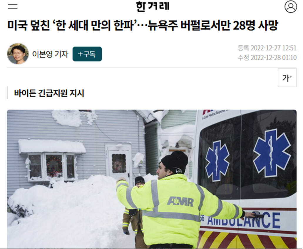 -지난해 미국 소식. '미국 덮친 ‘한 세대 만의 한파’…뉴욕주 버펄로서만 28명 사망'