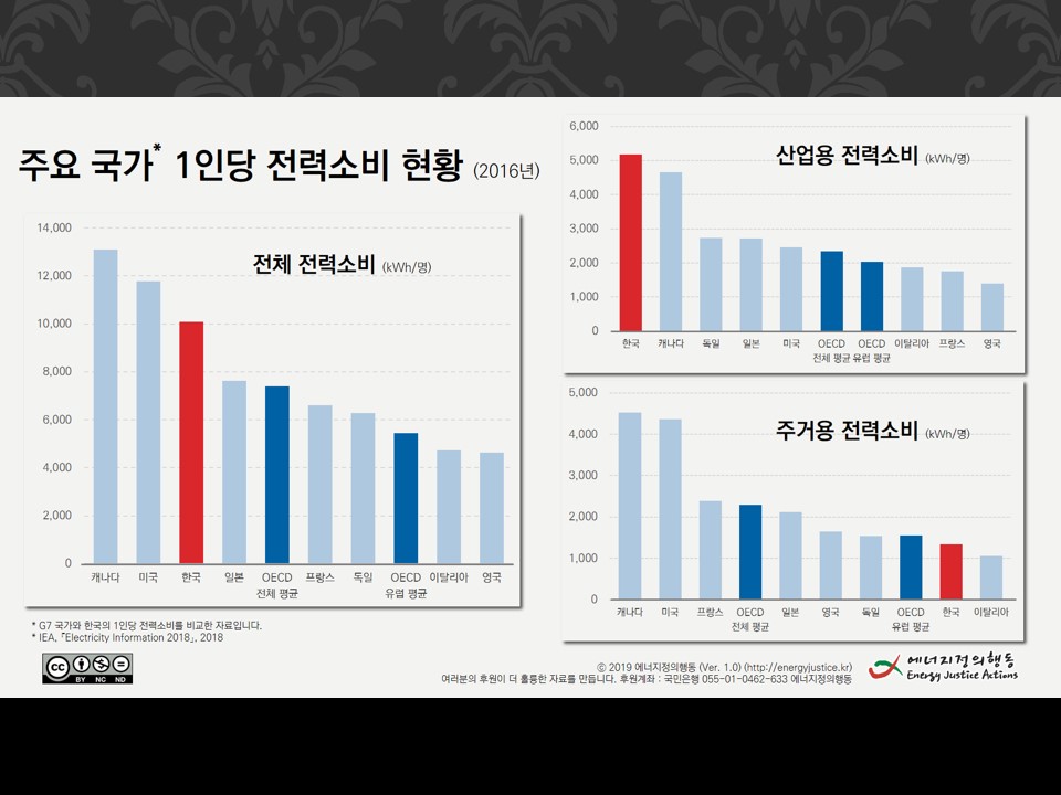 왼쪽의 도표는 단순 평균, 그러니까 산업과 가정용을 구분하지 않은 것이고, 오른쪽은 이를 산업과 가정으로 나눈 것입니다. 빨간색이 한국이고 짙은 파란색이 OECD 전체평균과 유럽평균입니다. 산업과 가정을 뭉뚱그려 놓으면 한국인 에너지 소비가 높지만 가정용만 떼어놓고 보면 유럽보다도 적게 쓰고 있는 것입니다. 한국인 1인당 소비가 높다는 것은 한국 기업들이 세계 경제에서 맡고 있는 분업 때문에 생기는 것이고, 그런 만큼 “전 세계가 한국인처럼 살려면 지구가 한 개로는 부족하다”는 좋게 말해 착시이고, 나쁘게 말하면 한국과 세계 기업들의 책임을 평범한 사람들에게 떠넘기는 것입니다.