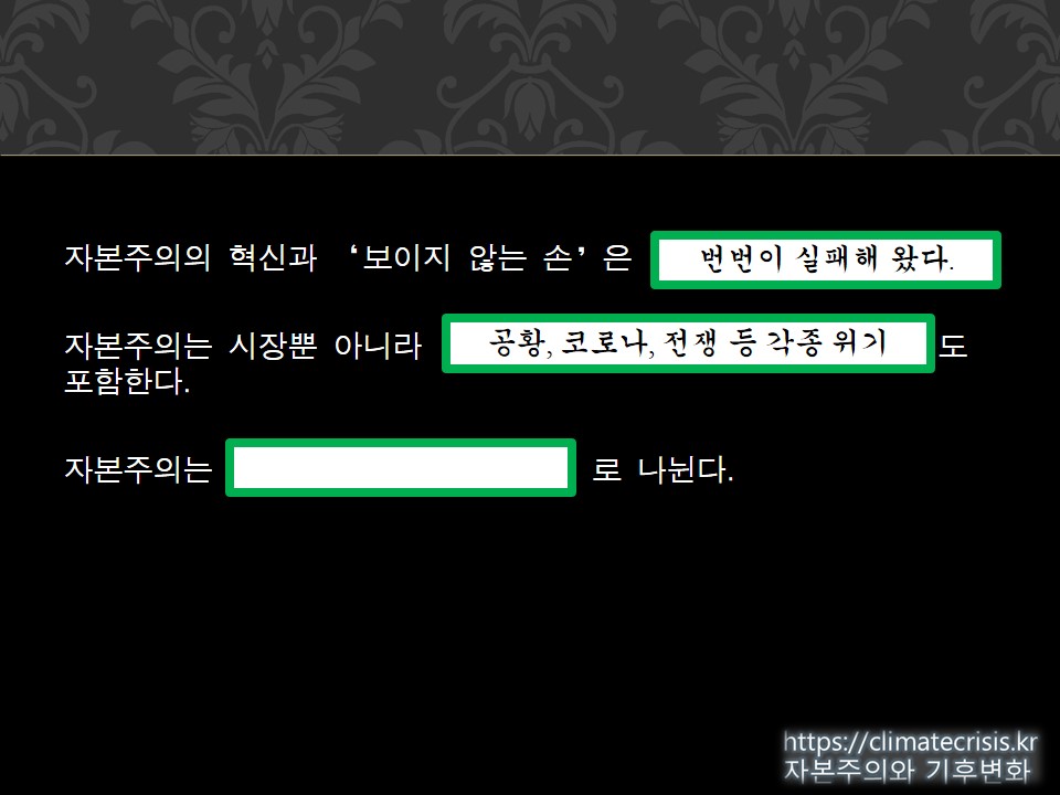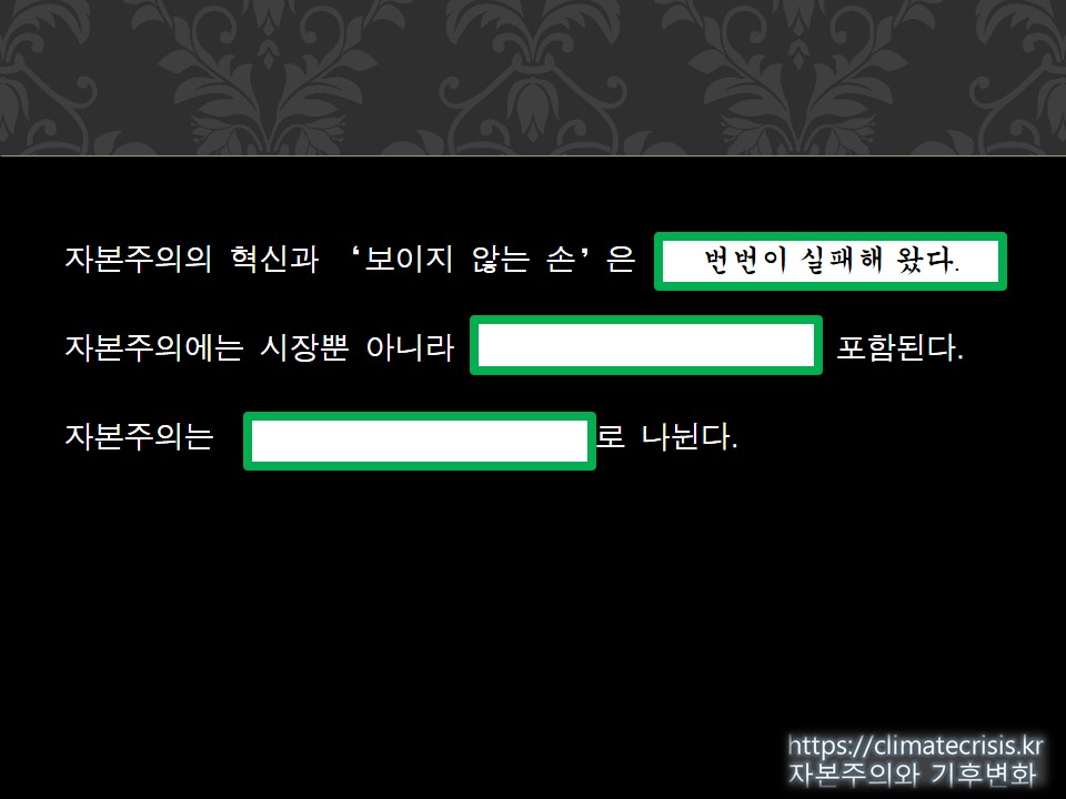 그래서 첫 번째 빈 칸은 이것입니다: 자본주의의 혁신과 '보이지 않는 손'은 번번이 실패해 왔다.