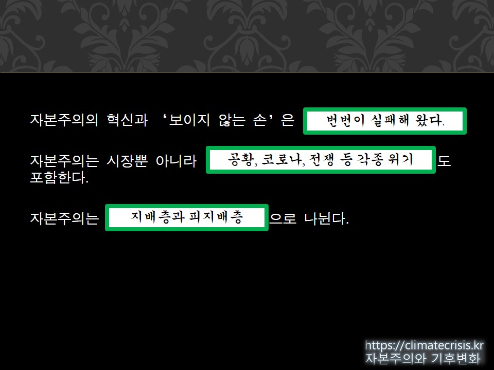이 세 가지 명제로부터 제가 드리는 답은 녹색자본주의로 기후위기를 해결할 수 없다는 것입니다. 흔히 기후 문제에서 인류가 모두 한 배를 탔다고 생각하지만 그렇지 않습니다. 피지배층에 속하는 사람들과 지배층에 속하는 사람들은 이해관계가 다릅니다. 자본주의를 지속하는 채로는 경제 위기뿐 아니라 전쟁과 갈수록 격해지는 환경 위기 때문에 온실가스 감축은 더더욱 뒤로 밀릴 수밖에 없습니다. 그리고 자본주의는 “정상 작동”할 때에조차 지난 수십 년간 기후 대응에서 맹점을 보여 왔습니다.