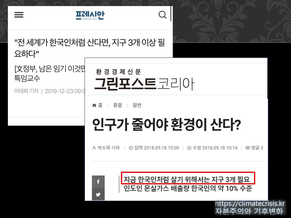 이 모든 폐단의 원인을 설명하는 방식이 전혀 다른 버전으로 두 가지 있습니다. 하나는 평범한 사람들이 편리함과 욕망을 추구한 탓에 기업과 정부가 그렇게 움직였다는 것입니다. 가장 대표적인 주장이 “전 세계가 한국인처럼 살려면 지구가 한 개로는 부족하다”는 주장입니다. 우리 한국인들이 너무 많이 먹고, 쓰고, 플러그 안 뽑고 다니고, 에어컨을 너무 빵빵 틀어대서 기후위기의 공범이라고 말합니다. 한마디로 우리가 너무 “풍족하다”고 말합니다.