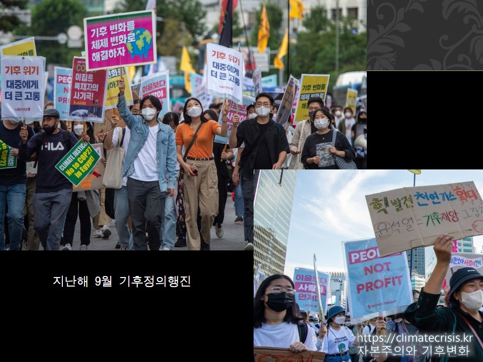 2000년대에는 환경단체들과 명동에서 부채를 나눠주며 에어컨 틀지 말자고 하며 기후변화에 관심을 호소했었습니다. 그러다 2009년 코펜하겐에서 ‘기후변화가 아니라 체제 변화’라는 구호(왼쪽 하단)로 대표되는 급진적인 운동이 부상했습니다.