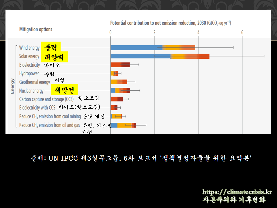 지난해 나온 IPCC 6차 보고서에서는 핵발전의 온실가스 배출량에 대한 정량적 언급을 찾을 수 없었습니다.(IPCC는 정치인들의 압력에 더 많이 휘둘린다고 알려져 있는데, 그 결과일까요?) 그럼에도 핵발전으로 감축할 수 있는 온실가스가 재생가능에너지보다 훨씬 적다는 것만은 다음과 같이 분명하게 밝혔습니다.