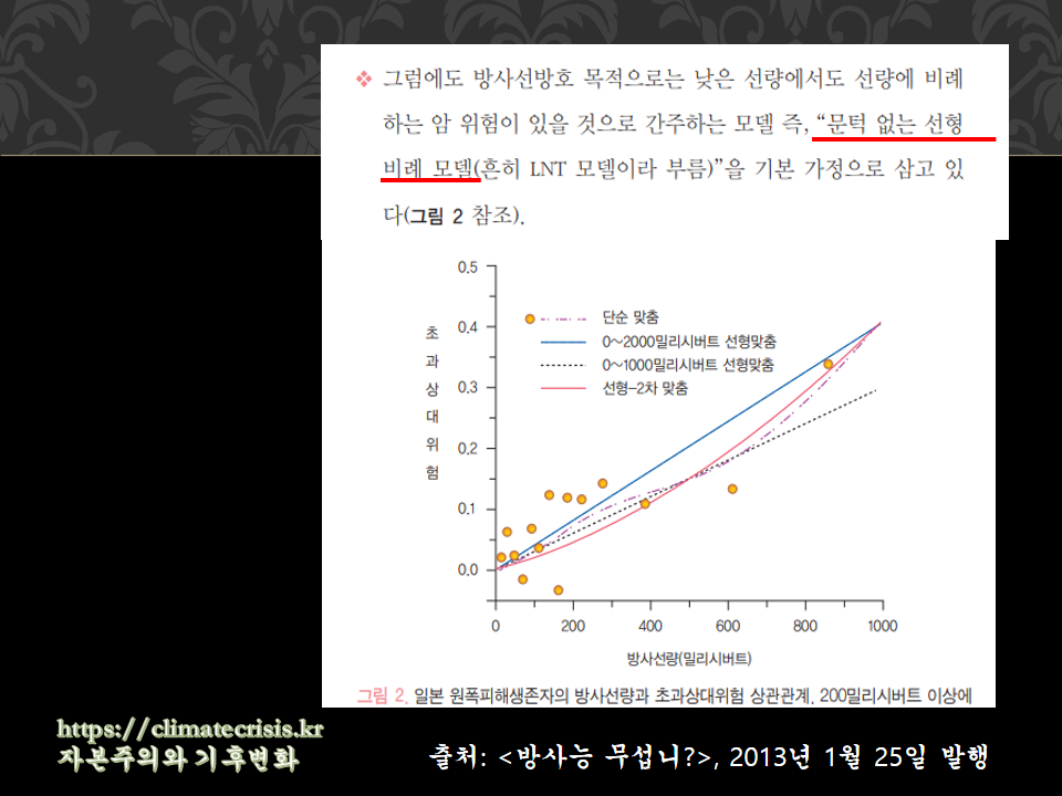 그런데 사실 증거가 부족한 것도 아닙니다. 제가 이번에 나눠드린 사전 자료 2페이지 오른쪽에 실린 그림은 그런 점에서 중요합니다. 그 그림은 지금껏 인류가 실시한 유일한 방사능 인체 실험, 즉 일본 원폭 투하 피해 생존자들을 조사해서 얻은 결과입니다. 그 그림에서 중요한 문구는 “문턱 없는 선형비례모델”이라는 것입니다.