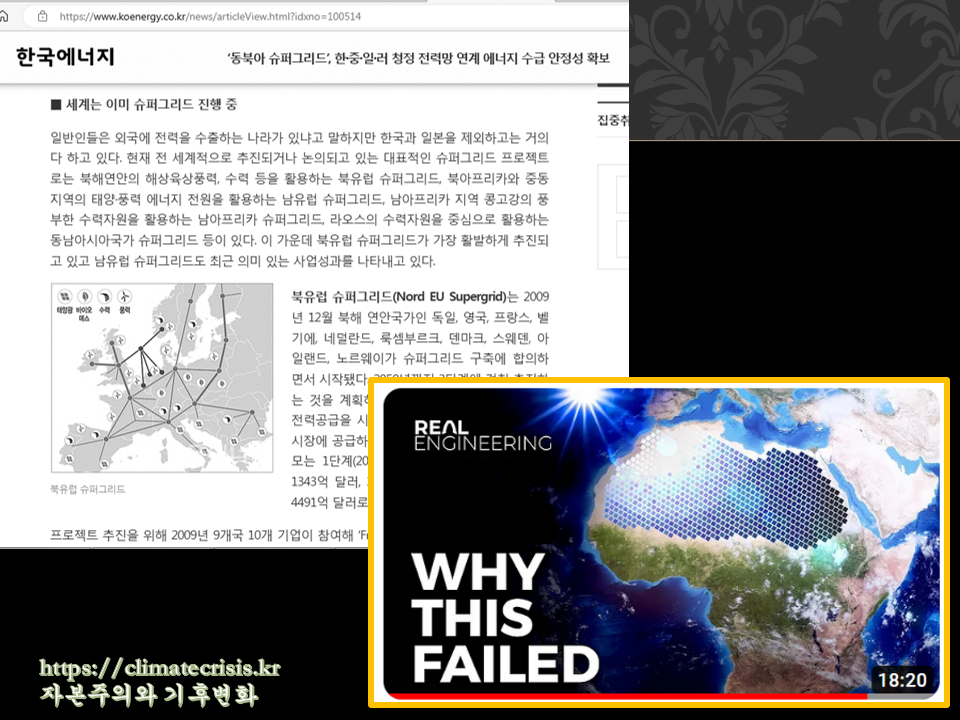 기술이 있는데도 그것이 실현이 안 되는 이유는 역시나 사회적 문제입니다. 우측 하단에 썸네일을 표시한 유튜브 영상은, 사하라 사막의 태양에너지를 지중해 건너편 유럽에 공급하려던 계획이 왜 실패했는지를 설명한 것입니다.(제가 지난번 시간에 앞서 나눠드린 사전 자료에서 소개했었죠.)