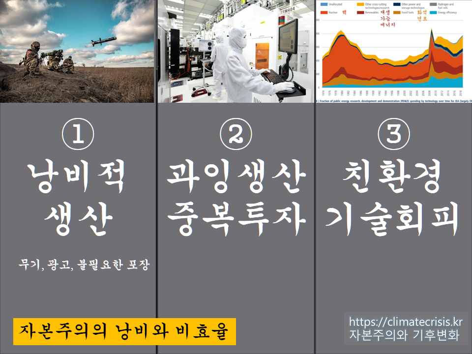 셋째, 자본주의에서는 각 생산자가 협소한 이해관계만을 좇는 탓에 사회 전체적으로는 좋은 게 분명할지라도 이윤 경쟁에서 밀리면 친환경 기술이 선택받지 못합니다. 재생가능에너지가 그 중요도에 비해 수십 년째 적게 투자되는 이유이고, 반면에 핵무기로 전용이 가능한 핵발전에는 무수한 돈이 몰리는 이유입니다.