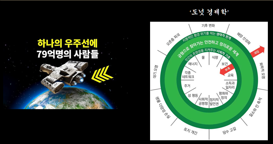 우주선 지구와 도넛 경제 생태관에서는 자연이라는 블록과 인간이라는 블록이 따로 있고, 둘은 근본적으로 배타적 관계에 있고, 역시 잘해야 적대적 공존입니다. 그래서 맬서스주의와 철학적으로는 다르지 않다고 하는 것입니다.