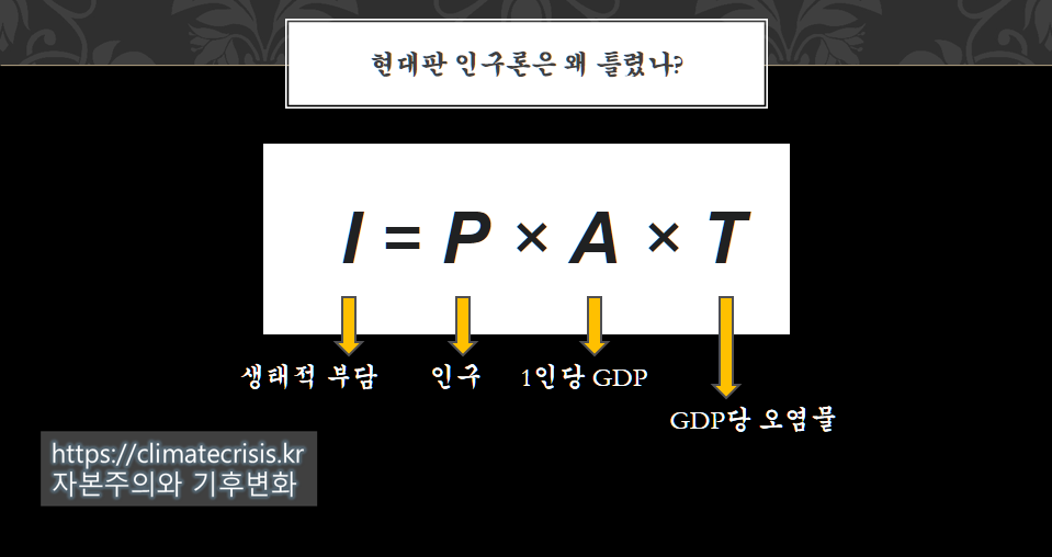 그렇다면 왜 틀렸을까요? 얼릭은 인류가 생태계에 가하는 부담을 다음의 공식으로 산정할 수 있다고 주장했습니다:
