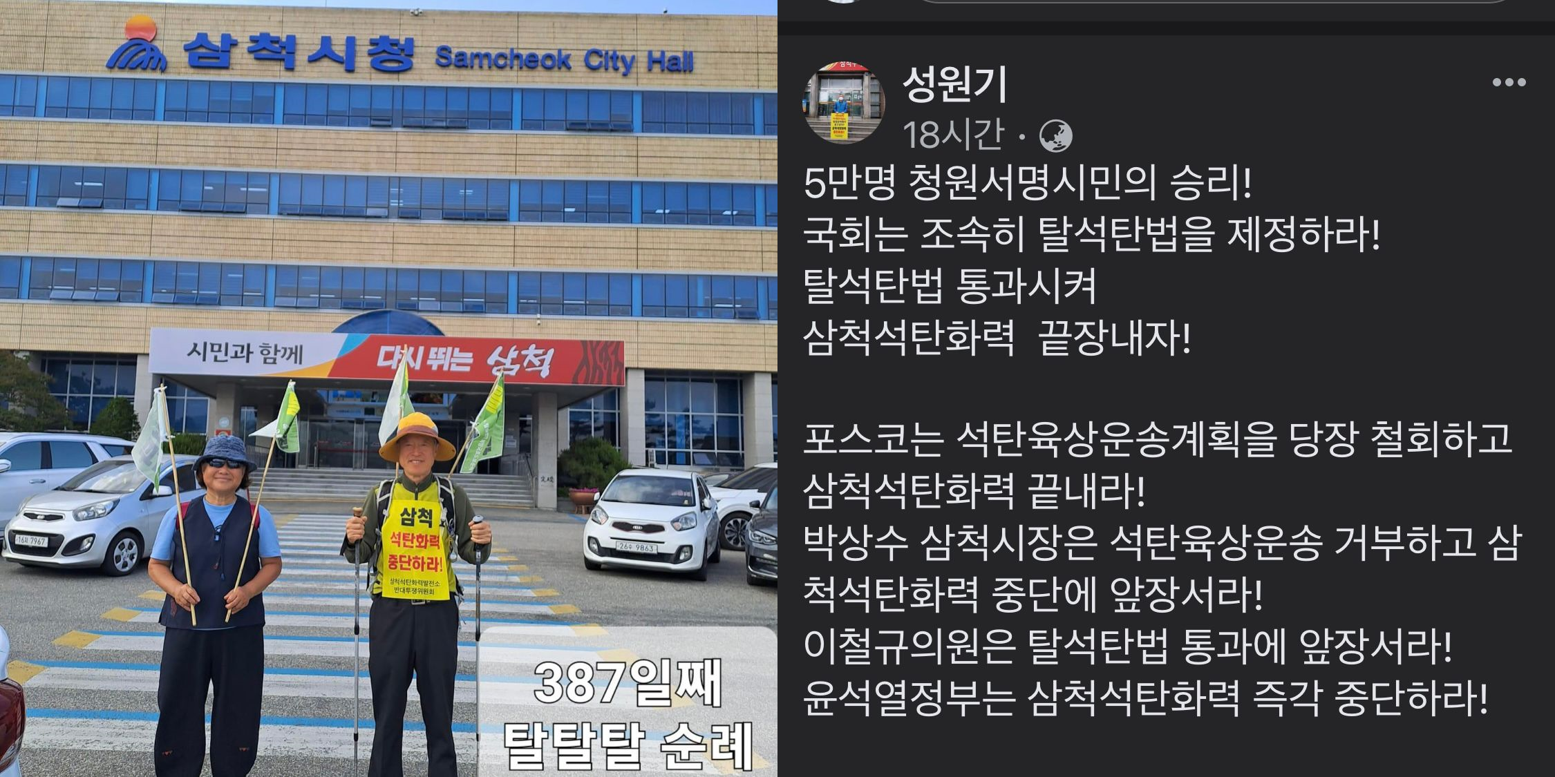 - 삼척화력발전반대투쟁위원회 성원기 공동대표는 삼척과 동해 시청 앞에서 꾸준한 활동을 SNS에 올리고 있습니다.
