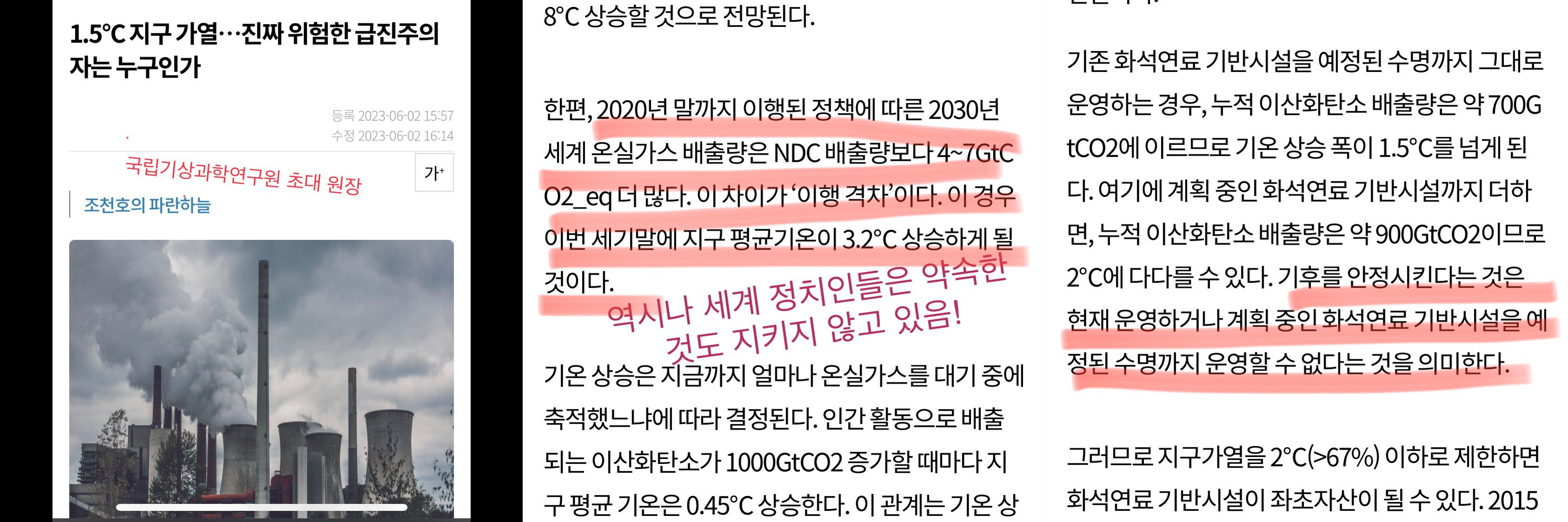 마침 <한겨레>에는 신규 화석연료 시설을 막는 것으로는 부족하고, 이미 가동 중이거나 건설 중인 것들도 조기폐쇄•허가취소 시켜야 한다는 전문가 컬럼이 떴다. (보수적인) IPCC 추산으로도 그렇다고 강조하고 있다.