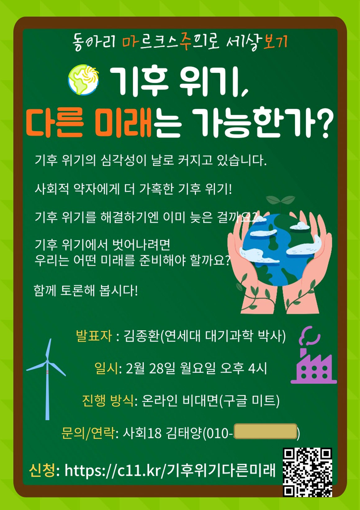 오늘 연세대 동아리에서 저를 초대해 주셔서 학생들과 '기후 위기, 다른 미래는 가능한가?' 라는 주제로 모임을 가졌습니다. 제가 20분동안 발제를 했고, 다른 참석자들께서 다양한 질문과 의견을 밝혀 주셨습니다.